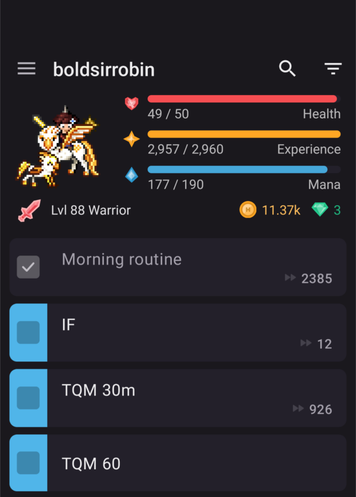 I got into to the streaks thing with an Android app called simply Streaks about ten years ago, but have mainly been using Habitica, which is a bit more sophisticated, combining daily habit streaks with more intermittent activities (good and bad) and a to-do list, all wrapped up as a role-playing game with retro bitmap graphics.
